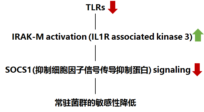 機(jī)體與皮膚常住菌群的長(zhǎng)期互作,通過病原體相關(guān)分子模式皮膚表面的模式識(shí)別受體的特異性識(shí)別,減少TLR受體在細(xì)胞表面的表達(dá)以及激活白介素相關(guān)激活酶3(IRAK-M),通過抑制抑制細(xì)胞因子信號(hào)傳導(dǎo)抑制蛋白(SOCS1)的表達(dá),達(dá)到降低常駐菌群敏感性的目的。